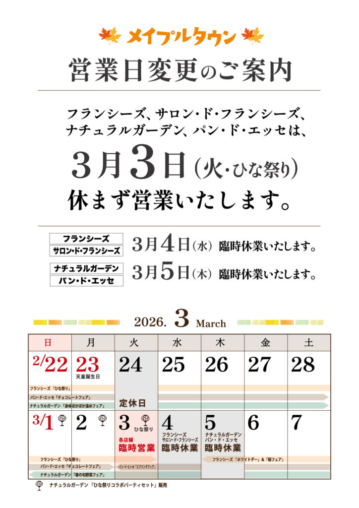 3月3日(火)臨時営業・3月5日(木)臨時休業の営業変更のご案内